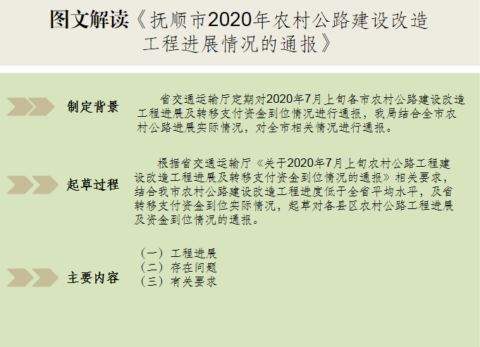 按照全省普通公路“项目管理年”活动总体部署,省交通运输厅根据省绩效考核序时进度目标,对各市2020年7月上旬农村公路建设改造工程进展及省转移支付资金到位情况进行通报。为了加快我市农村公路工程进展,对各县区农村公路工程进展及省转移支付资金到位情况进行通报。